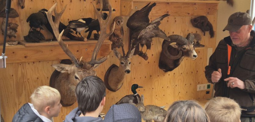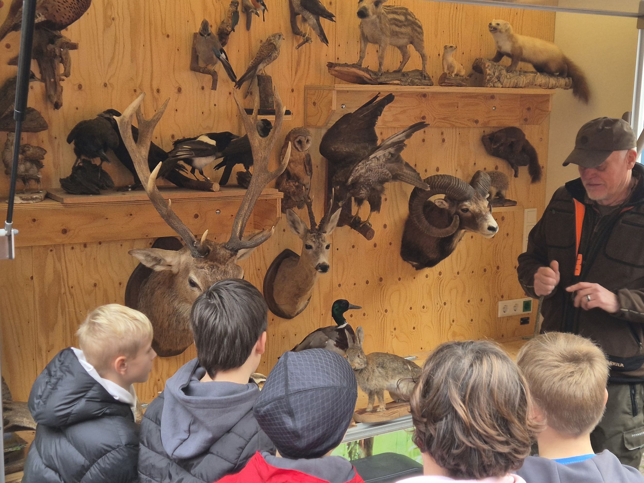 So berichtete, erklärte und erläuterte Andreas Jürgensmeyer von der Kreisjägerschaft Minden-Lübbecke, der von seinem Rauhaar-Dackel Pauli begleitet wurde, anhand von präparierten Tieren, wie Dachs, Fuchs und Marder zum Beispiel eine Wohngemeinschaft haben oder wie sich Fasan, Rebhuhn und andere Vögel in der Natur verhalten. Geduldig beantwortete er alle Fragen unserer Schülerinnen und Schüler, für die dieser Besuch ein aufregendes Erlebnis war.