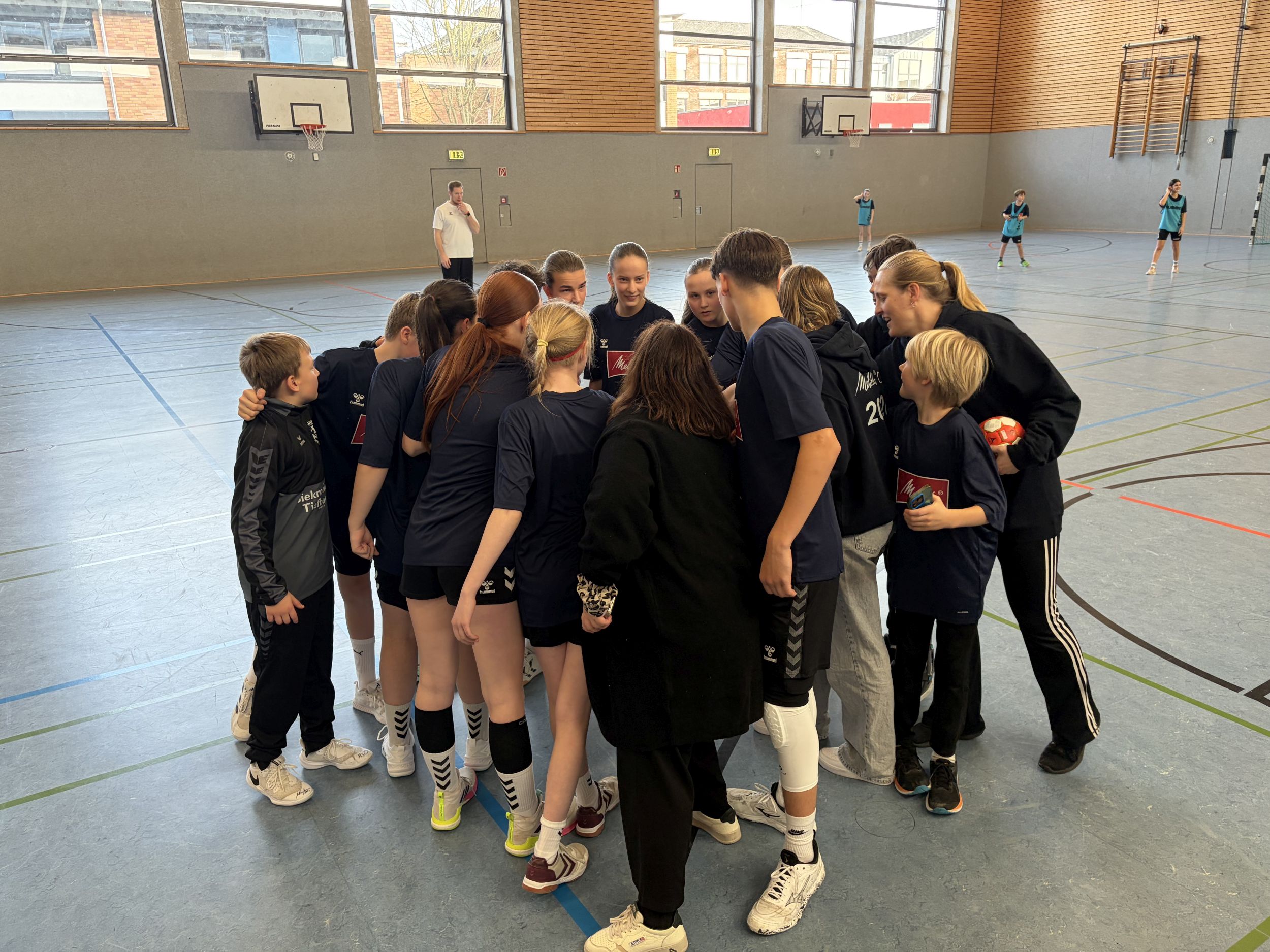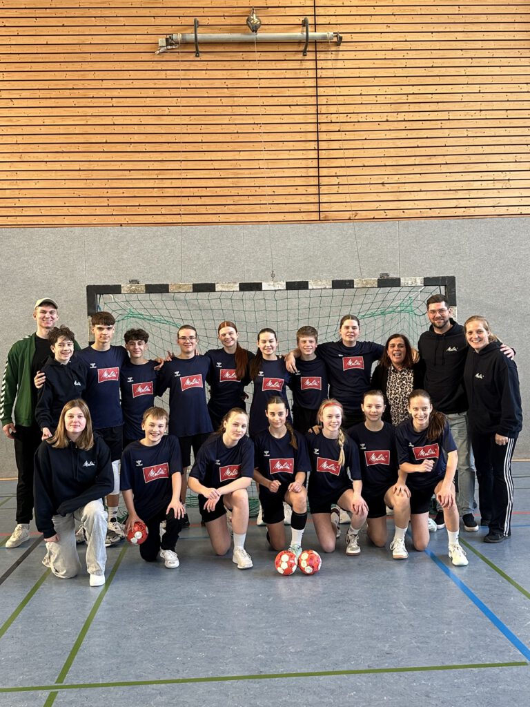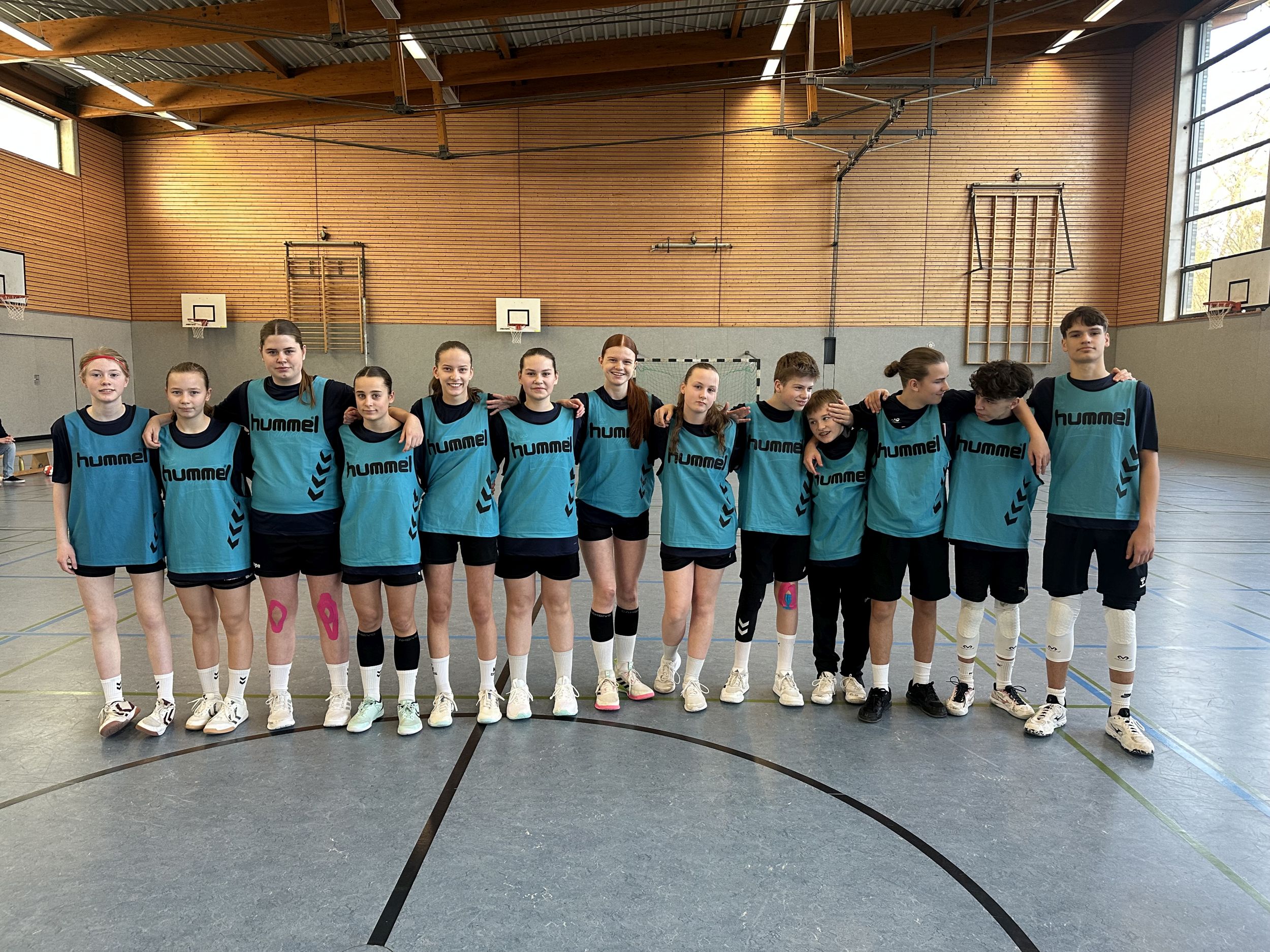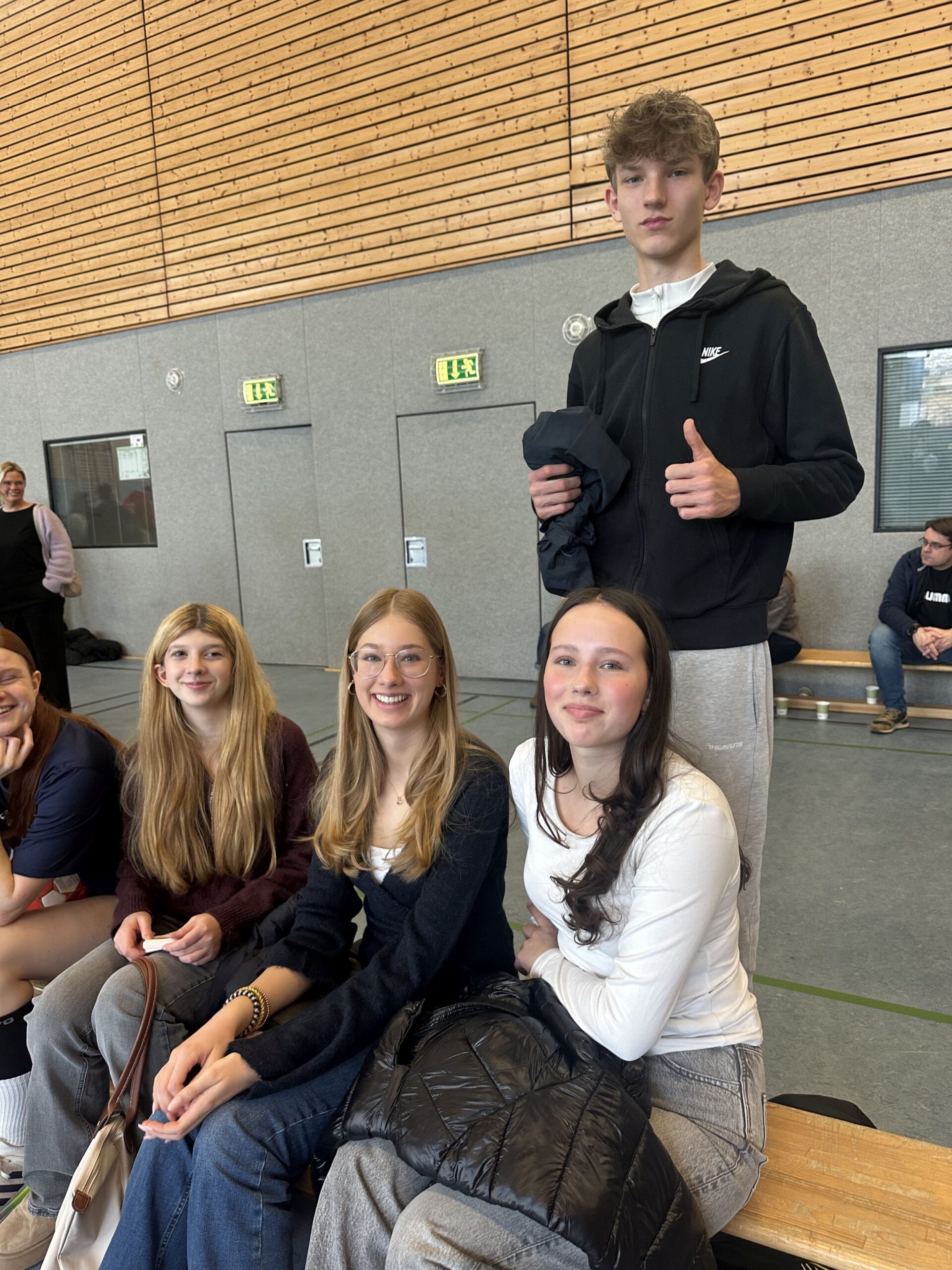 Unsere Schulmannschaft zeigte von Anfang an, dass sie nicht nur mithalten, sondern wieder ganz vorne mitspielen kann. Nach der Mittagspause wartete dann das Highlight: Die Profis von GWD Minden kamen als Paten für die Mannschaften in die Halle. Unser Team bekam Unterstützung von Daniel Astrup Pedersen, der uns mit Motivation und echtem Profi-Feeling durch die restlichen Spiele begleitete. In unserer Gruppe erkämpften wir uns damit den zweiten Platz und durften so im Spiel um Platz drei antreten. Im kleinen Finale mussten wir uns gegen das Herder-Gymnasium behaupten. Die Partie begann jedoch alles andere als ideal: Früh geriet unsere Mannschaft 1:5 in Rückstand, doch an Aufgeben war nicht zu denken. Mit Ruhe gelang die Aufholjagd in der nur zwölf Minuten dauernden Spielzeit. Angetrieben von Teamgeist, Spielfreude und lautstarker Unterstützung drehten wir das Spiel und sicherten uns am Ende den dritten Platz– genau wie im Vorjahr!