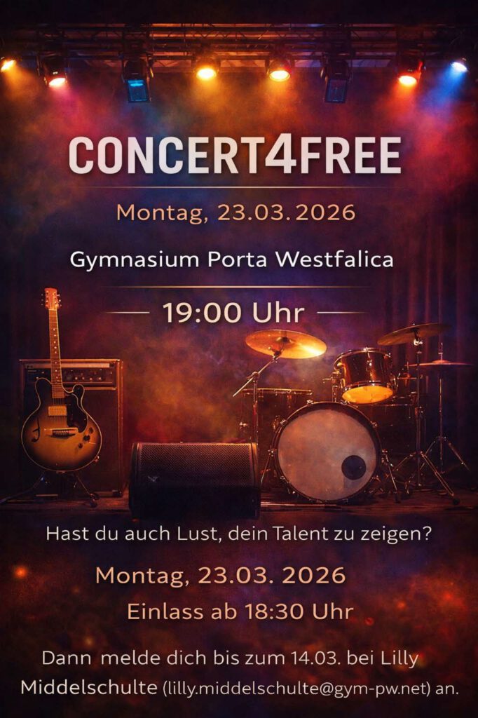 Am 23.03.2026 um 19:00 Uhr findet das diesjährige Concert4free im Forum des Gymnasiums statt. Der Eintritt ist frei, Einlass ist bereits ab 18:30 Uhr. Für deine Anmeldung benötigen wir: